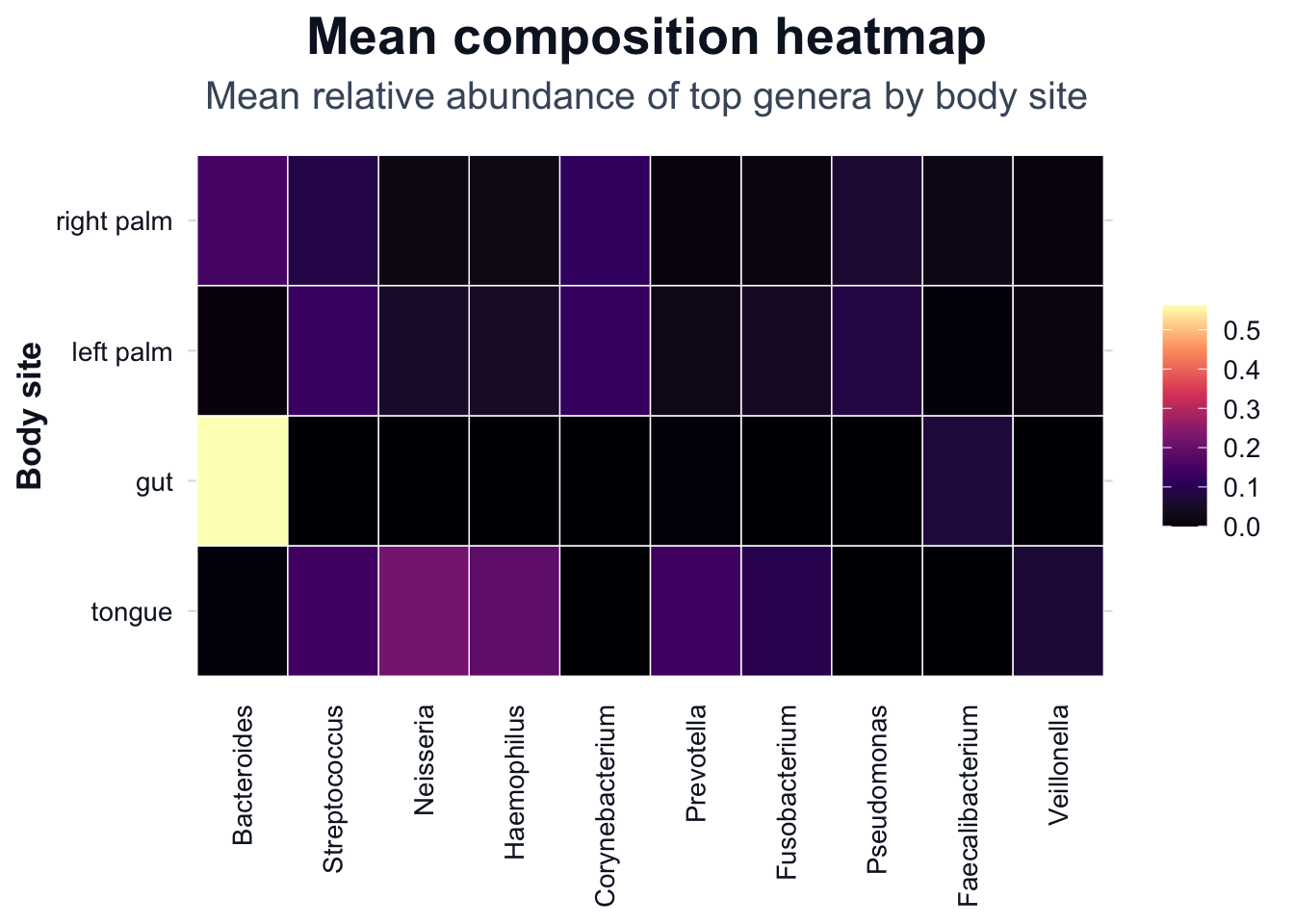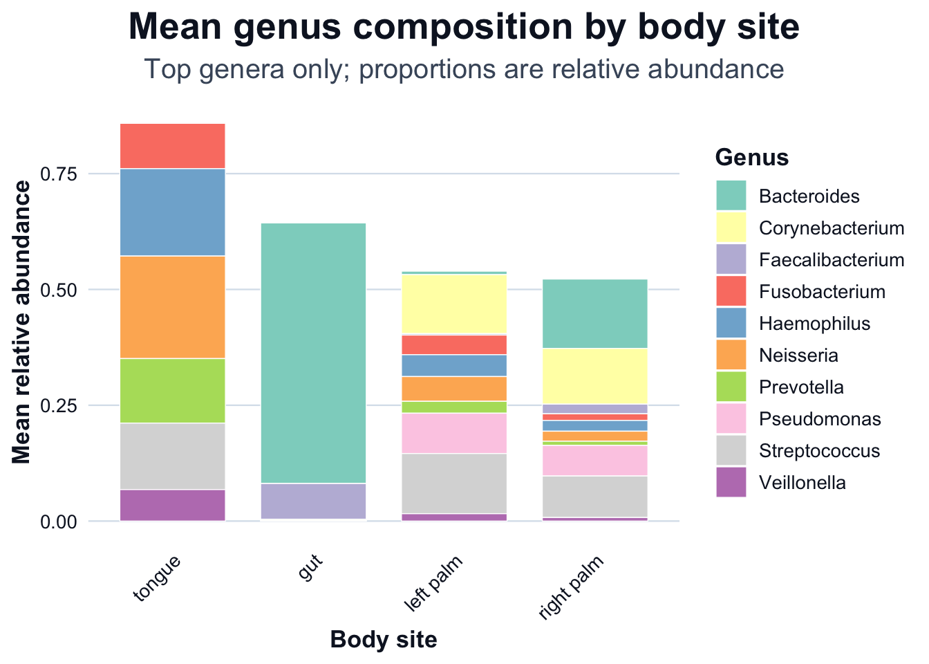 We compute mean relative abundance by body site, then visualize it using two R figures: a stacked bar chart and a heatmap.