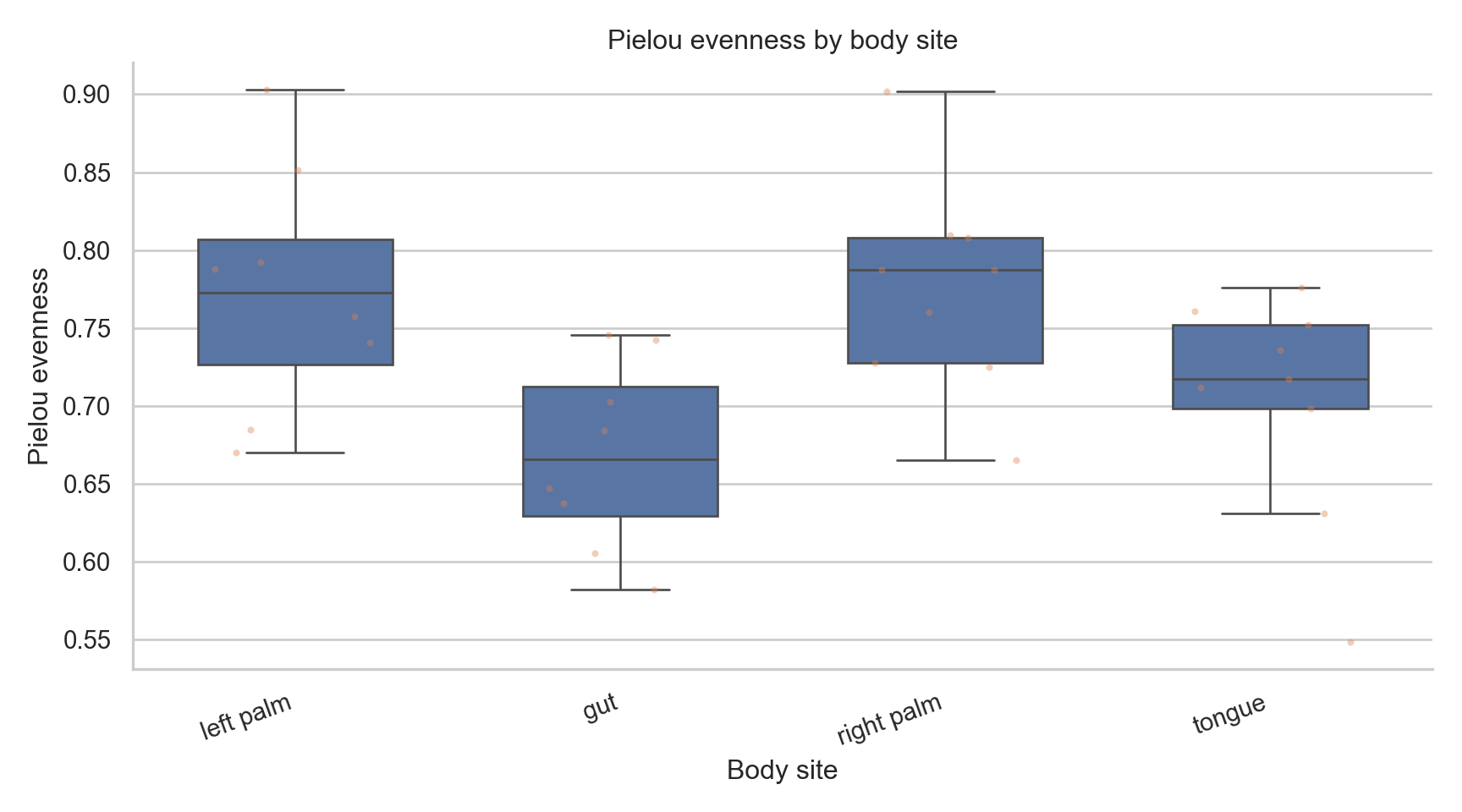 Text(0.5, 1.0, 'Pielou evenness by body site')